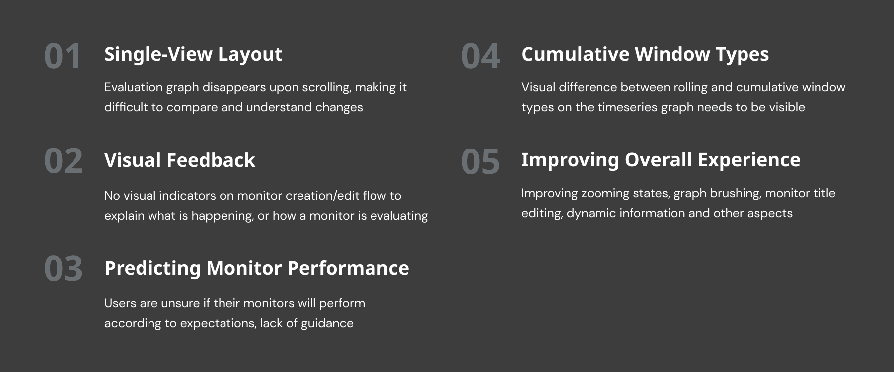 Based on the current user experience and the various pain points SREs currently face, 5 key areas of improvement were identified.