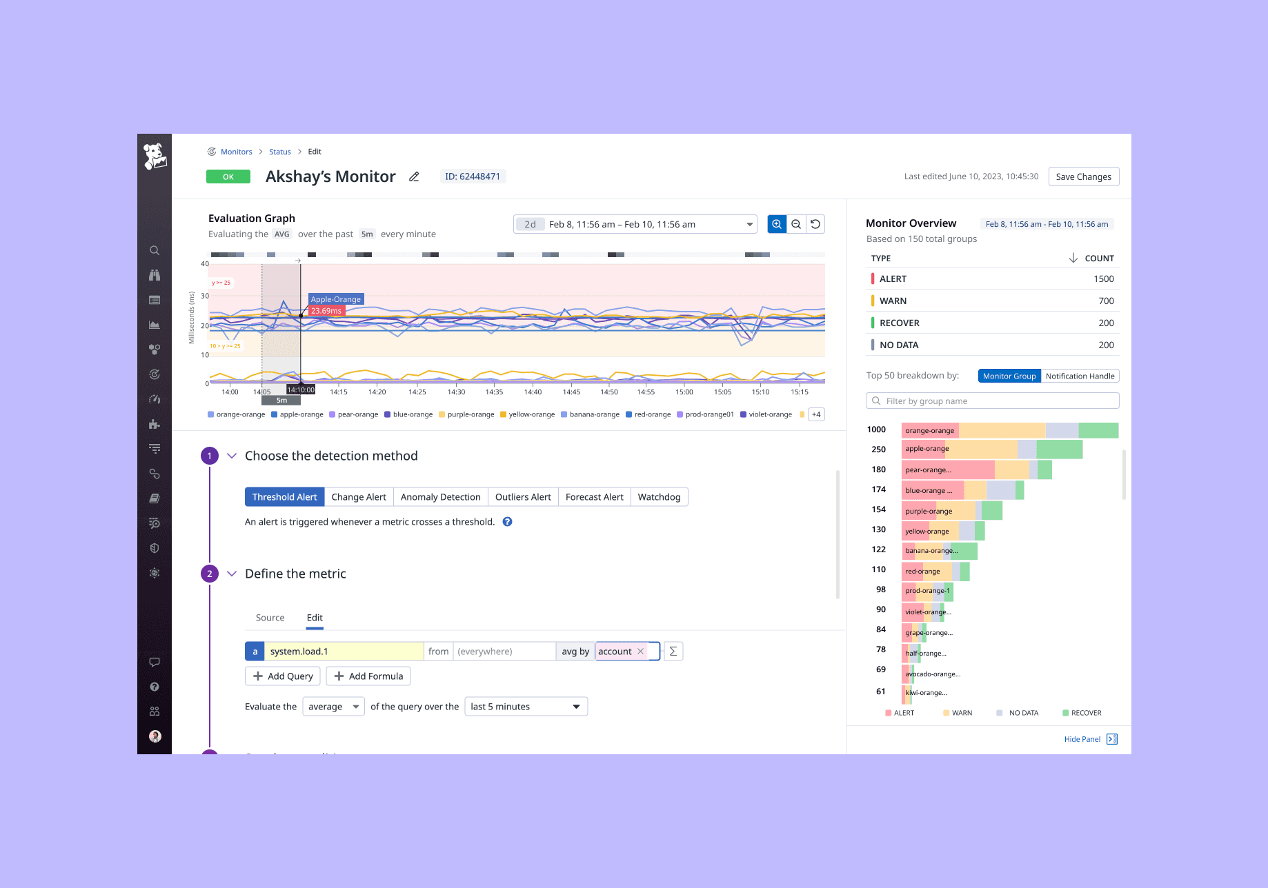 01 —> The page features a three-block layout with a sticky scrolling timeseries evaluation graph at the top, followed by a monitor configuration stepper below it. Additionally, a collapsible side panel provides a high-level summary of metrics, including a group breakdown of top alerting groups and notification recipients