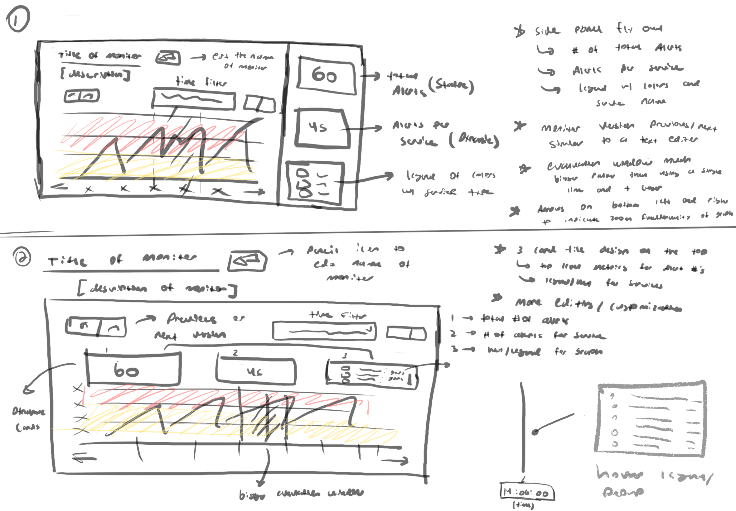 These products had similar, yet slightly different design patterns which was used as a source of information for the Monitors page. I also annotated aspects of our existing platform by identifying potential areas of improvement and components that appeared to be confusing from a first-time user perspective. My goal here was to develop a mental model of the overall product.