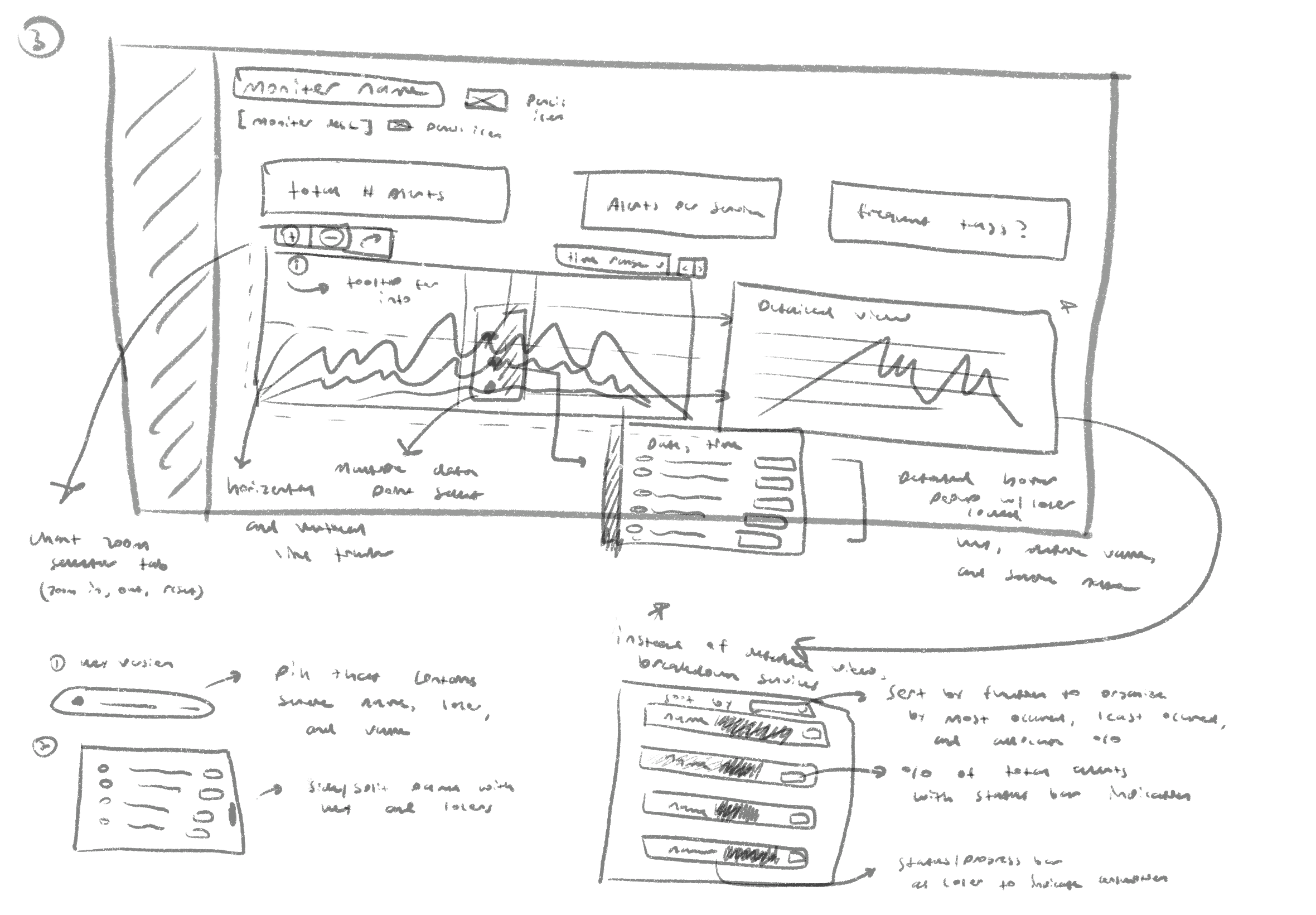 It was time to go to the drawing board, and sketch out wireframes which detailed different overlays and page layouts. Here, I focused on allocating space for high-level metrics, and detailed tooltips.