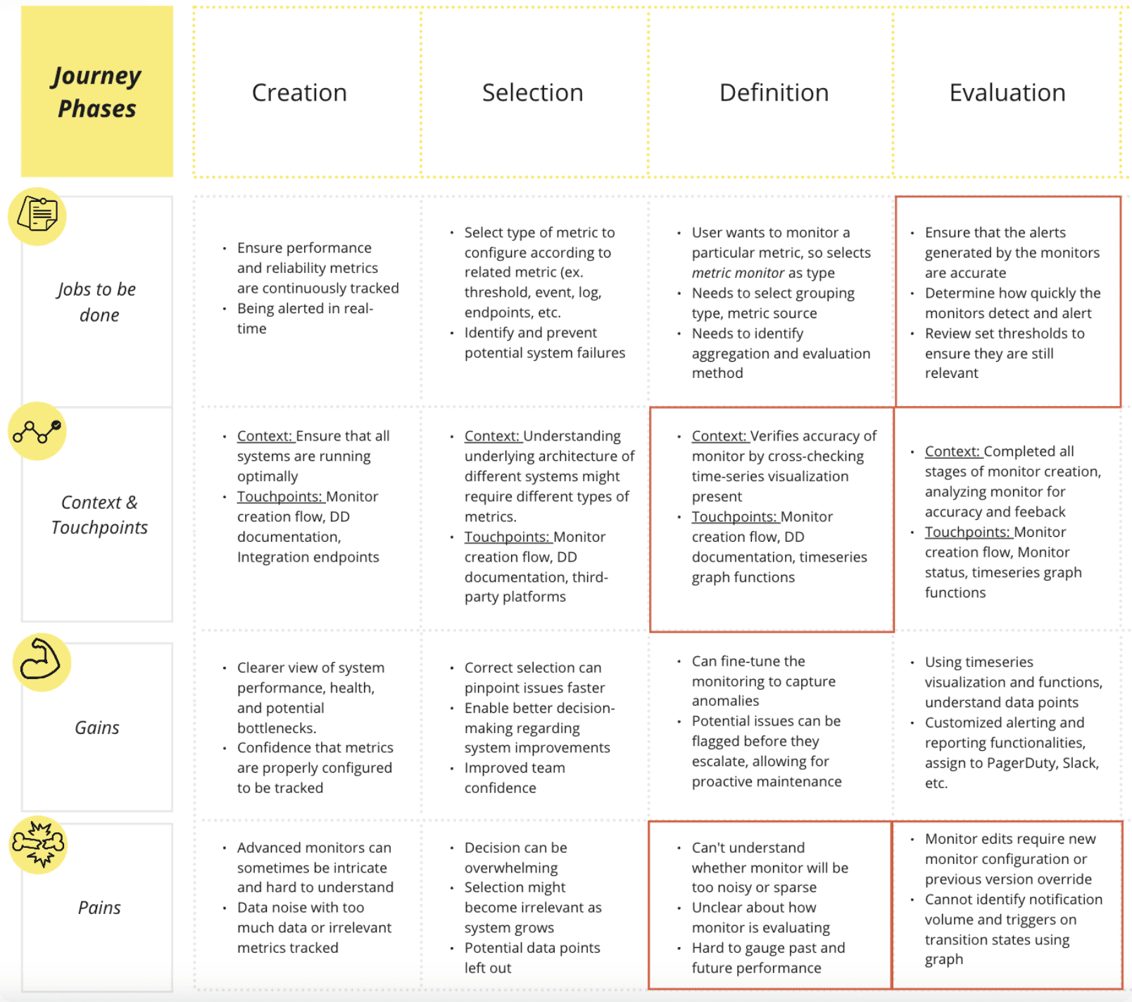 Below is a user journey map that outlines the various jobs, touchpoints, pains, and gains an SRE experiences while going through the monitor creation process. It’s important to note that the red squares indicate the most pressing opportunity spaces in the user journey, as highlighted by RUM (Real-User Monitoring) analysis and understanding customer support tickets.