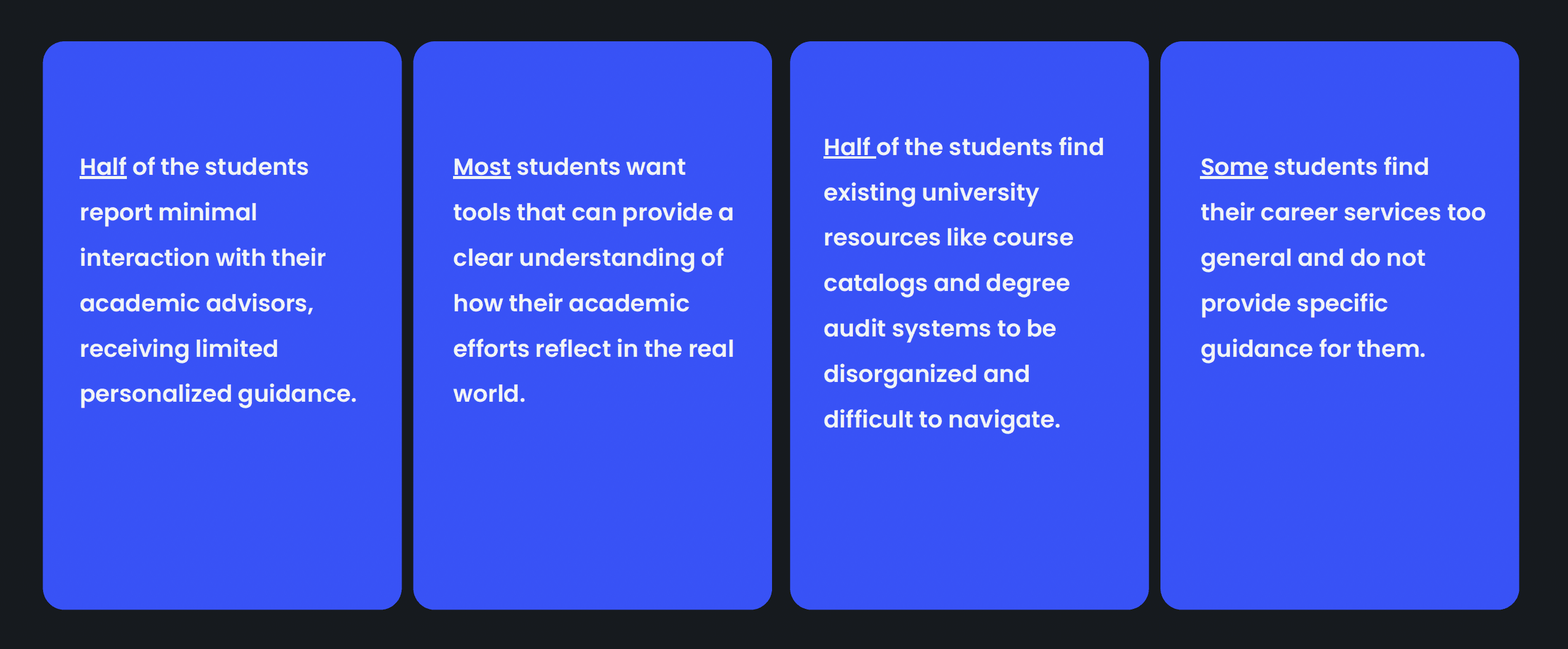 Students rely on a wide variety of resources like word-of-mouth, LinkedIn, and Reddit, making it difficult to find trustworthy advice. Additionally, academic advisors at institutions often manage too many students, making it difficult to provide personalized guidance to students on the skills and credentials they need for success.
